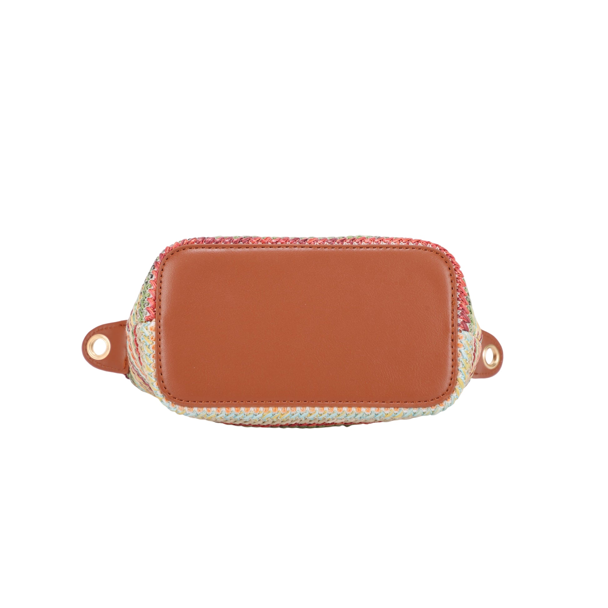 Designed with a beautifully woven multicolor body, this bag features warm faux leather top handles and a classic flap with snap closure for a clean, structured finish. The contrast trim adds a refined touch, while the decorative side tassel detail gives it a fun, effortless vibe.